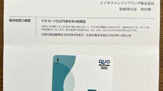 株主優待 ビジネスエンジニアリング(株) [4828] ビジネスエンジニアリングから500円分のQuoカードをいただきました。権利確定は年2回ですが、優待は年4回いただけます。クオカードを使いたいがゆえにマツキヨに行く頻度が上がっています。普段は20日にウェルシアに行くんですけど。 2025.09.03 株主優待