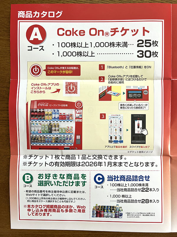 北海道コカ・コーラボトリング(株) [2573] 株主優待 X Facebook はてブ LINE コピー 2025.09.04 北海道コカコーラの優待案内が届きました。100株保有で、(A)Coke Onチケット25枚 (B)選んだ商品1箱 (C)製品詰め合わせ22本 のどれかです。今までの選択肢に加えて、Coke Onチケットが追加されましたね。好きなタイミングで好きなドリンクに変えられるうえ、製品を送っていただくより本数が多い。嬉しい。というわけで、Coke Onチケットをお願いしました。楽しみ。
