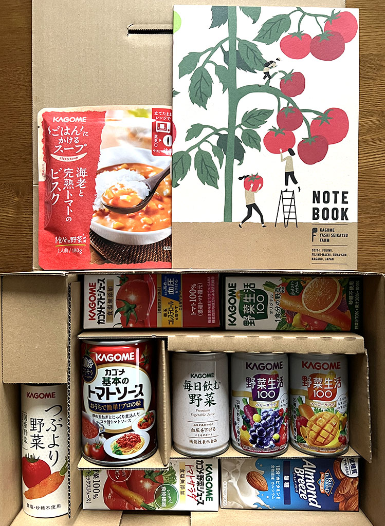 カゴメ(株) [2811] 株主優待 X Facebook はてブ LINE コピー 2025.10.162025.10.17 カゴメより、商品詰め合わせが届きました。100株なので2,000円相当。半年以上継続保有するといただけます。200mLほどのドリンクはランチに持っていくのに重宝します。 基本のトマトソース ごはんにかけるスープ 海老と完熟トマトのビスク 毎日飲む野菜 つぶより野菜 野菜生活100 オリジナル 野菜生活100 マンゴーサラダ 野菜生活100 ベリーサラダ カゴメトマトジュース 食塩無添加 カゴメ野菜ジュース トマトサラダ アーモンド・ブリーズ 無糖 ノート