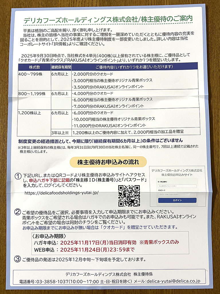 デリカフーズより、「株主優待ご案内」が届きました。