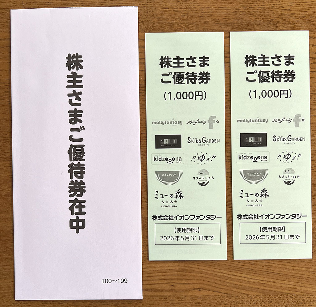 イオンファンタジーから、「株主さまご優待券」をいただきました。100株なので2,000円分です。