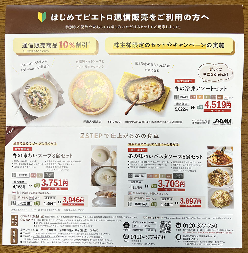 (株)ピエトロ [2818] 株主優待 X Facebook はてブ LINE コピー 2025.11.06 ピエトロより、通信販売での優待価格ご案内が届きました。最近ときどき購入してます。オンラインに登録すると、いつでも優待価格で買えるので便利。