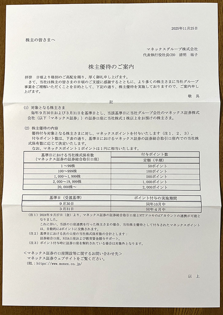 マネックスグループから、「株主優待のご案内」が届きました。
