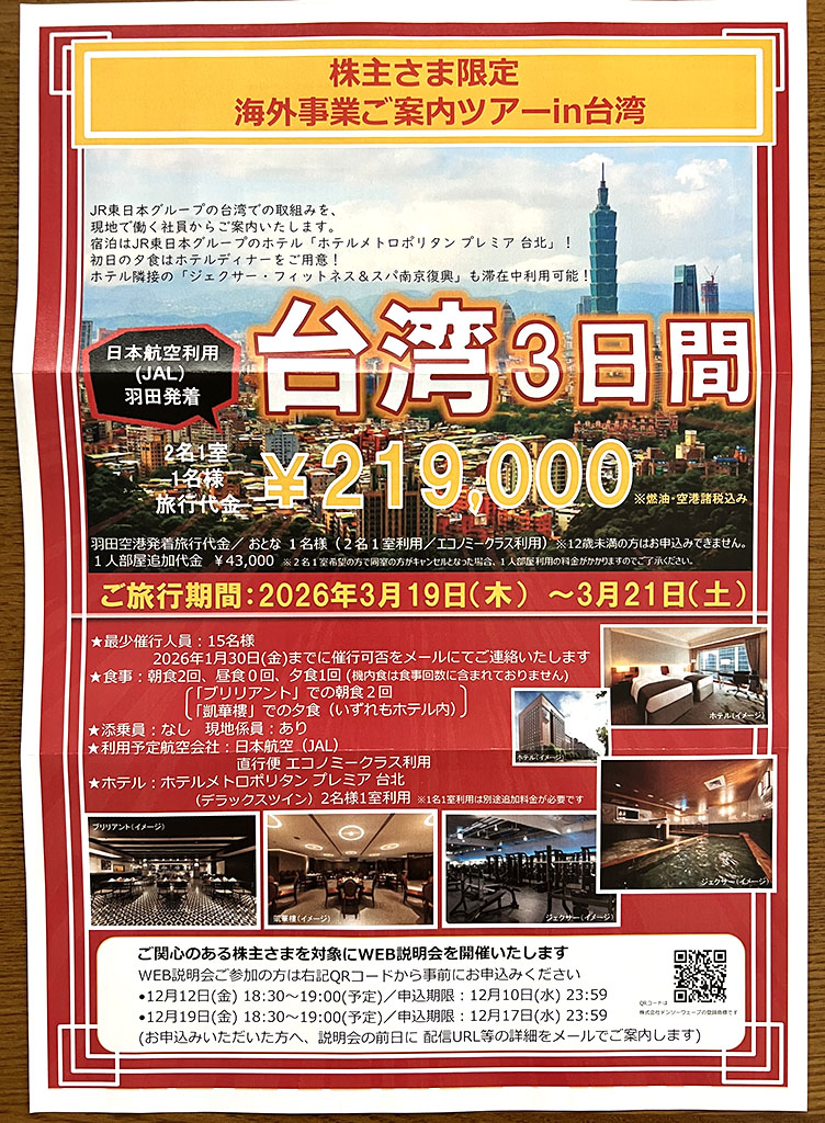 東日本旅客鉄道(株) [9020] 株主優待 X Facebook はてブ LINE コピー 2025.12.03 JR東日本から、「株主の皆さまへの案内」が届きました。株主限定のイベント案内(抽選)やクーポンが載っています。株主限定の台湾ツアーですって。面白そうですね。日程的に行けないので申し込みできませんけど…。残念。クーポンはほとんどオンライン用コードです。JRE BANKのキャンペーンもあり。新規開設だけでなく、すでに口座を持っていても参加可能な特典があって嬉し。そんなにハードル高くないので参加しよー
