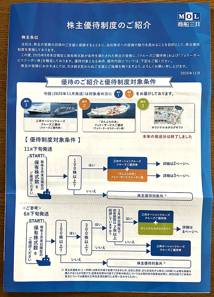 (株)商船三井 [9104] 株主優待 X Facebook はてブ LINE コピー 2025.12.03 商船三井から、「株主優待制度のご紹介」と併せて、[クルーズご優待券]と[株主優待のフェリーサービス共通クーポン券]が届きました。保有株数などでいただけるものが違うので、フローチャート式に説明してくださっています。問い合わせが多かったのかな…