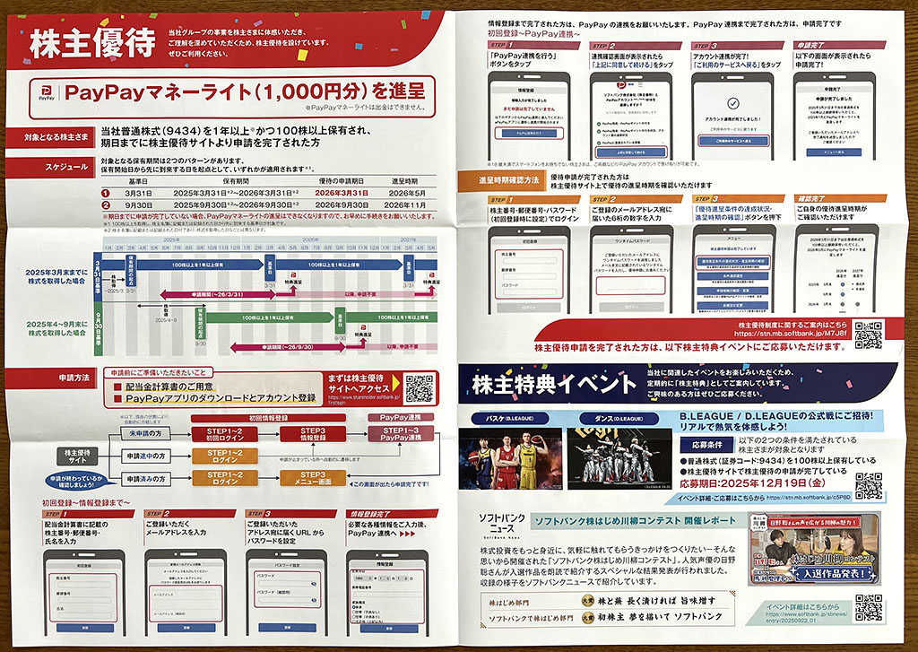 ソフトバンク(株) [9434] 株主優待 X Facebook はてブ LINE コピー 2025.12.082025.12.10 ソフトバンクから優待の案内が届きました。100株を1年以上保有すると、1,000円分のPayPayマネーライトを頂けます。半年前に手続きを済ませていたので、今は特にやることもなし。来年5月の付与を待つ状態です。