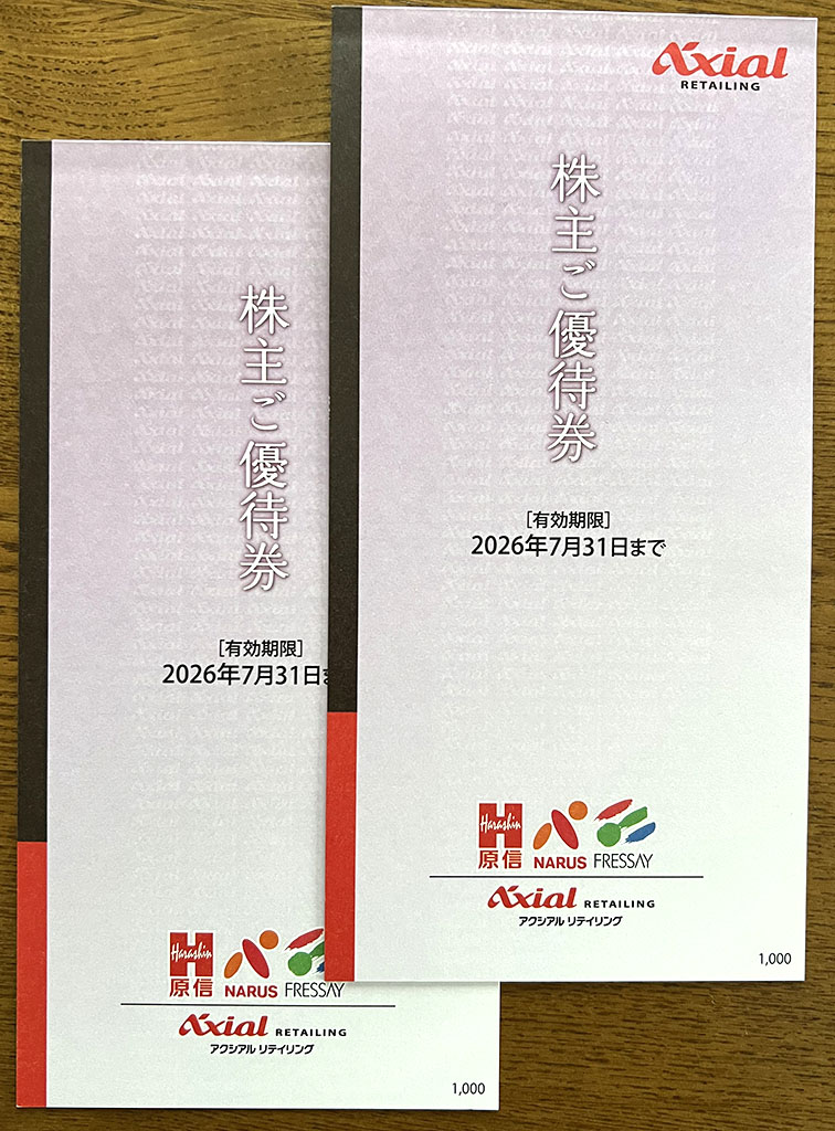 アクシアル リテイリング(株) [8255] 株主優待 X Facebook はてブ LINE コピー 2026.01.272026.02.01 12月8日の記事で案内のあったアクシアルの優待が届きました。400株保有で、「株主ご優待券」2,000円分です。行動範囲に店舗があるので、全額活用させていただきます。 アクシアル リテイリング(株) [8255]食品スーパーのアクシアルから「株主ご優待制度について」という案内が送られてきました。400株保有しているので、「2,000円分の株主優待券」か「1,000円分のクオカード」が選べます。新潟県と群馬県に住所がある場合、何もしなければ株主優待券...