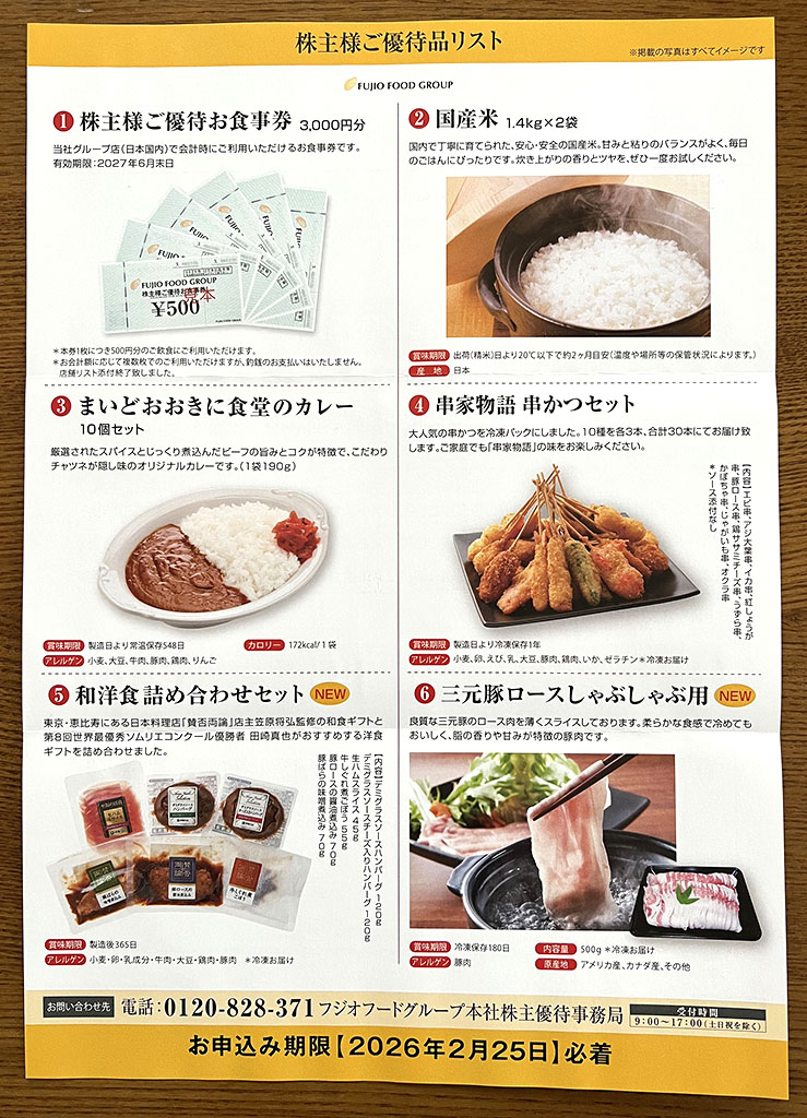 フジオフードから「株主様ご優待のお申込みご案内」が届きました。3,000円相当の品を、以下の9種類から選べます。
