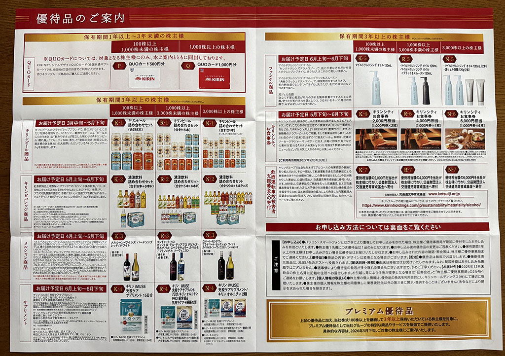 私は3年以上保有しているので、キリンの製品をいただけます。100株だと2,000円相当。