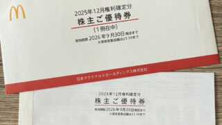 株主優待 日本マクドナルドホールディングス(株)[2702] マクドナルドから「株主ご優待券」が届きました。100株なので6枚つづり1冊です。普段、ドライブスルーで買うことが多いので気付かなかったのですが、久しぶりに店内で買おうと思ったら、セルフオーダーが導入されていました。どこもかしこもセルフオーダ... 2026.03.27 株主優待