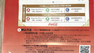 北海道コカコーラの優待案内が届きました。100株保有で、(A)Coke Onチケット25枚 (B)選んだ商品1箱 (C)製品詰め合わせ22本 のどれかです。一箱おなじ品物だと、途中で飽きてしまいがちなので、今回もCoke Onチケットにしま...